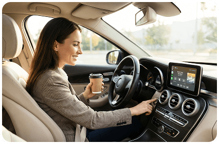 Calls, music, and navigation run wire-free, letting each drive settle in naturally.