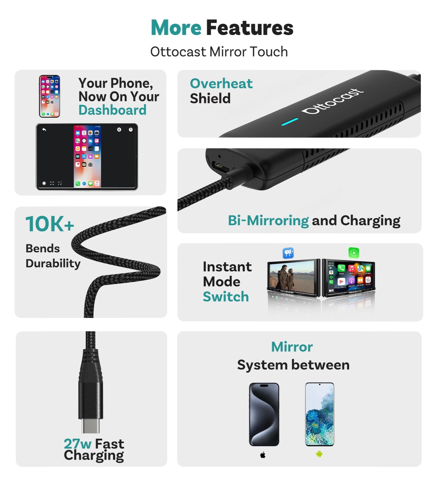 Ottocast Mirror Touch supports Android phones with DP (DisplayPort) Screen Mirroring. This allows you to mirror your phone’s screen to your car’s display. Please check if your phone supports DP screen mirroring in its settings.